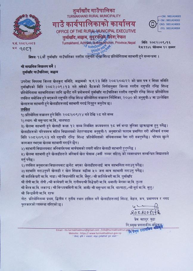 » १६ औं तुर्माखाँद गाउँपालिका स्तरीय राष्ट्रपति रनिङ शिल्ड प्रतियोगितामा सहभागी हुने सम्बन्धमा।