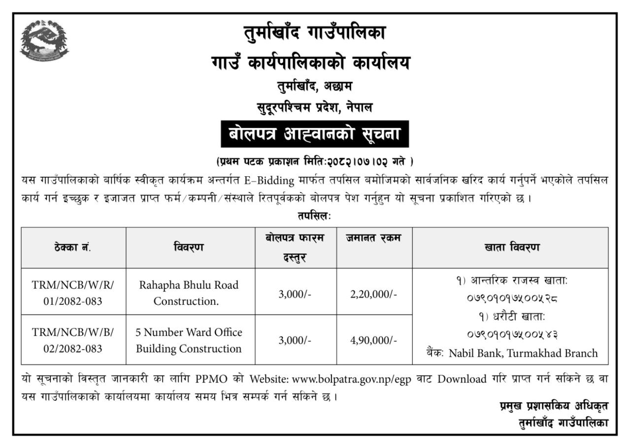 बोलपत्र आह्ववानको सूचना।(Rahapha Bhulu Road & 5 No. Ward Office Building Construction))
