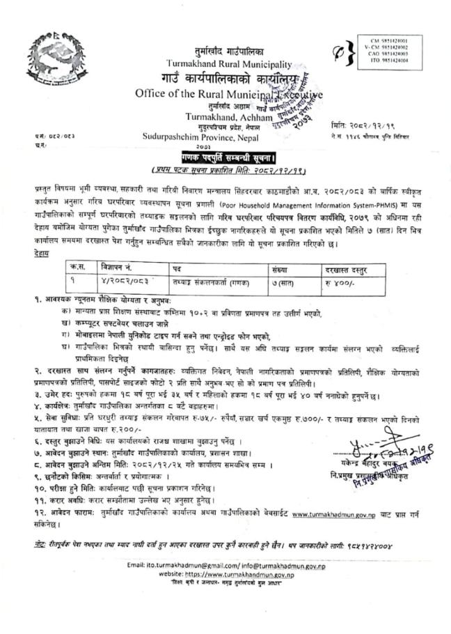 गणक पदपुर्ति सम्बन्धि सूचना। ( प्रथम पटक सूचना मिति:२०८२/१२/१९)