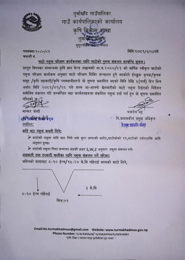 माटाे नमुना परिक्षण कार्यक्रमको लागि माटाे नमुना संकलन सम्बन्धि सूचना ।