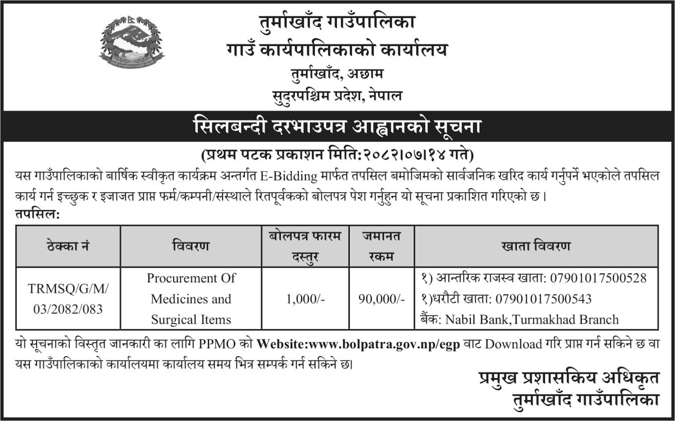 » सिलबन्दी दरभाउपत्र आह्नानको सूचना ।( Procurement Of Medicines and Surgical Items))